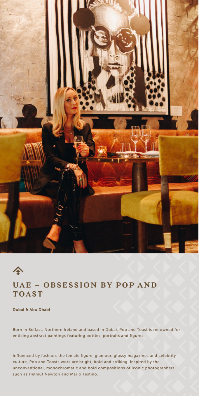 Born in Belfast, Northern Ireland and based in Dubai, Pop and Toast is renowned for enticing abstract paintings featuring bottles, portraits and figures. …